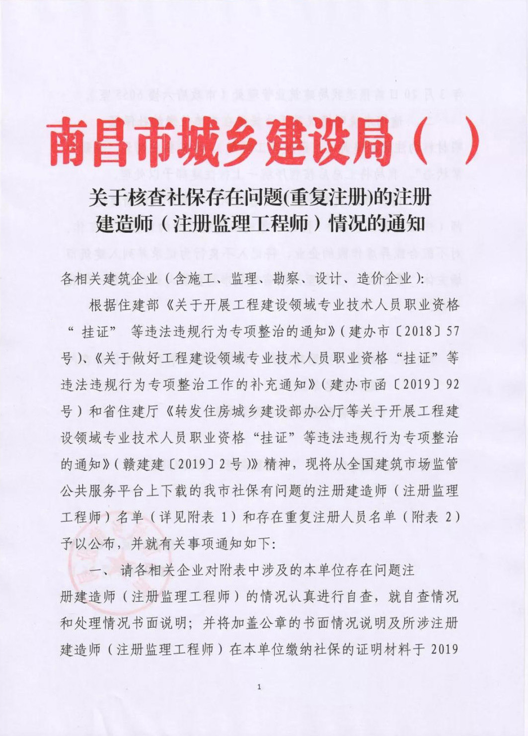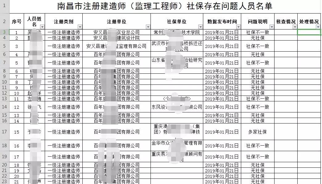 2019年2月26日南昌市住建局官網發布《關于核查社保存在問題(重復注冊)的注冊建造師(注冊監理工程師)情況的通知》,該通知附件公布了《南昌市注冊建造師(監理工程師)社保存在問題人員名單》