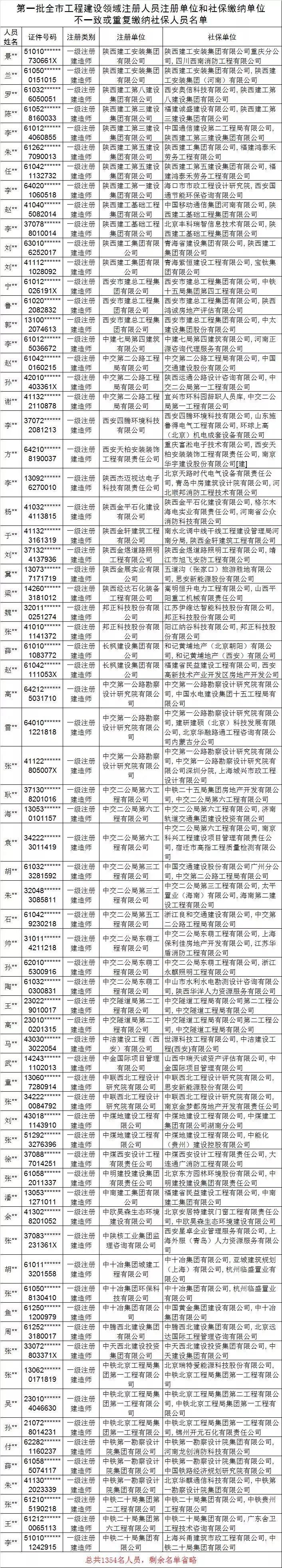 2019年2月02日西安市城鄉建設委員會官網發布《第一批西安市工程建設領域注冊人員注冊單位和社保繳納單位不一致或重復繳納社保人員名單》,第一批共1354名人員。問題統一為:多家社保。