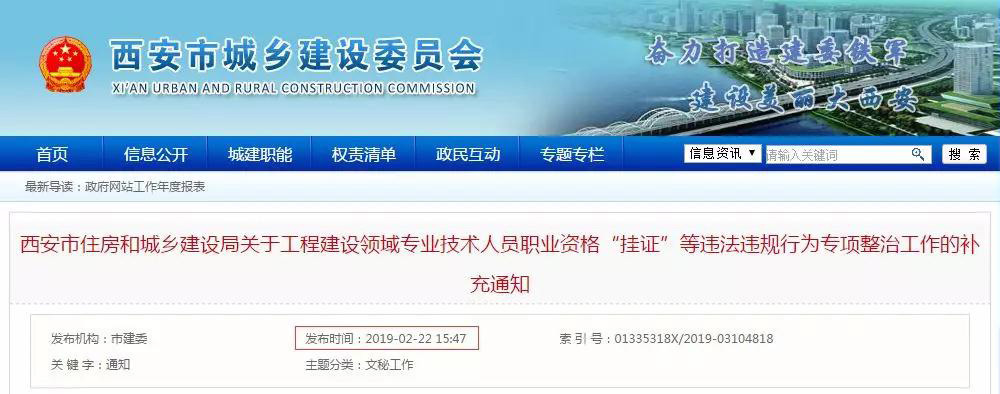 2019年2月2日,住房和城鄉建設部下發《關于做好工程建設領域專業技術人員職業資格“掛證”等違法違規行為專項整治工作的補充通知》。根據通知,明確: