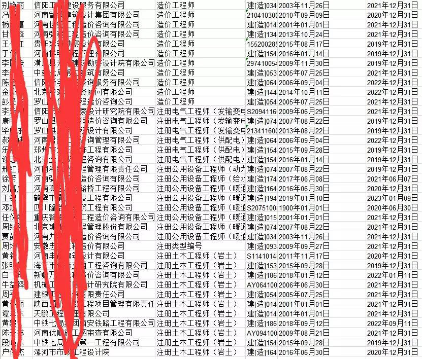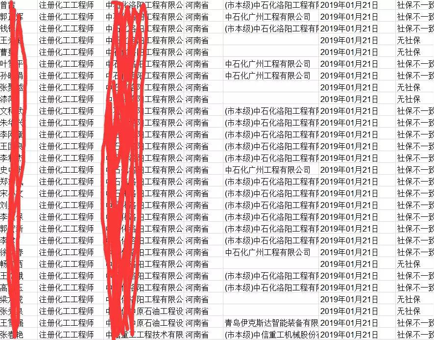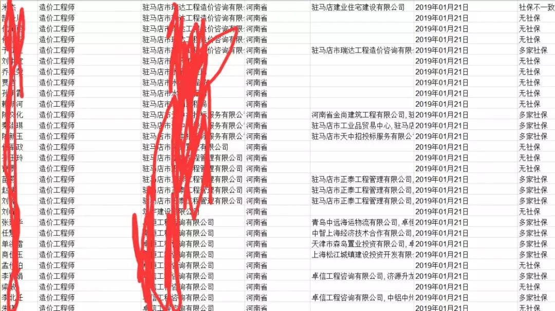 轉發通知:根據河南省廳通知,目前住建部已經將河南的二建、一建(含臨時建造師)、監理工程師等注冊人員注冊單位與社保單位不一致的嫌疑名單全部發來了,共涉及我省13.8萬人,這是住建部用大數據庫檢索出來的,請各公司認真核對各自注冊人員社保情況,上級要求三月份整改完畢,請大家重視。相關人員名單部分截圖如下