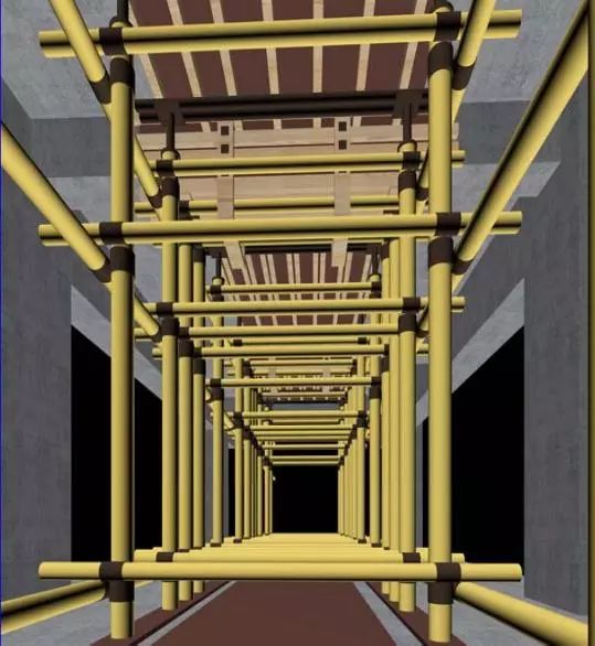 這個圖片看得比較清楚,水平桿是分開的,而且是錯開設置的。后澆帶設置獨立的剪刀撐,梁板模板剪刀撐單獨設置,拆模時,將灰色支撐拆掉,保留黃色支撐就可以了!