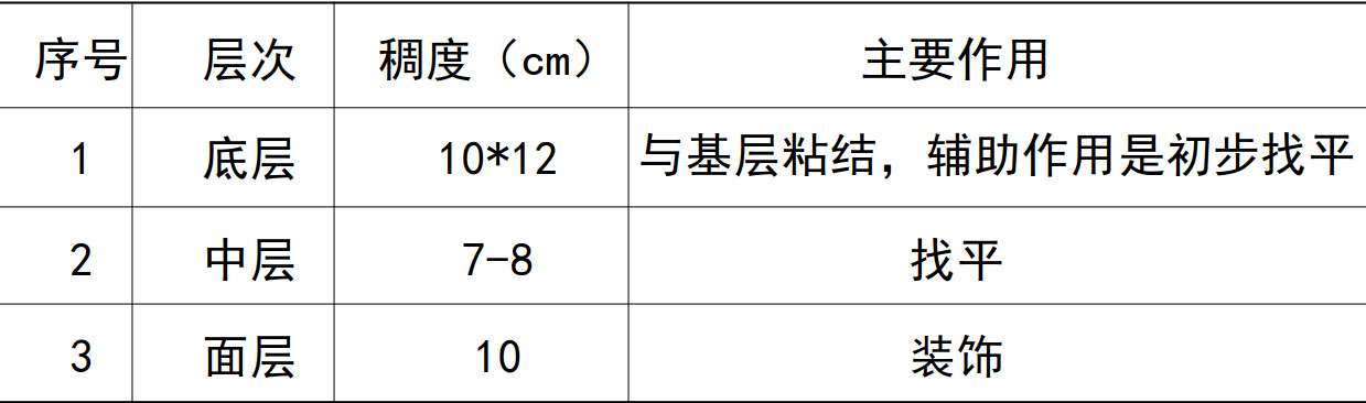 大面積抹灰前應設置標筋。抹灰工程應分層進行,通常抹灰構造分為底層、中層及面層,具體技術要求參照下表。其中,水泥砂漿不得抹在石灰砂漿層上;罩面石膏灰不得抹在水泥砂漿層上。