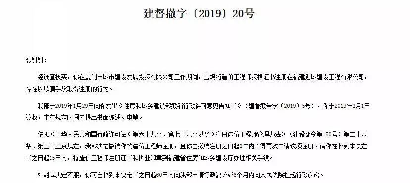 張釗釗在廈門市城市建設發展投資有限公司工作期間,違規將造價工程師資格證書注冊在福建進城建設工程有限公司,存在以欺騙手段取得注冊的行為。
