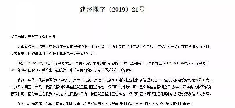 住建部擬撤銷此單位建筑工程施工總承包一級資質的行政許可,且自撤銷之日起3年內不得再次申請該項行政許可。