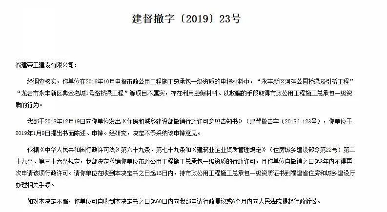 福建榮工建設有限公司在2016年10月申報市政公用工程施工總承包一級資質的申報材料中,“永豐新區河濱公園橋梁及引橋工程”“龍巖市永豐新區典金名城1號路橋梁工程”等項目不屬實。