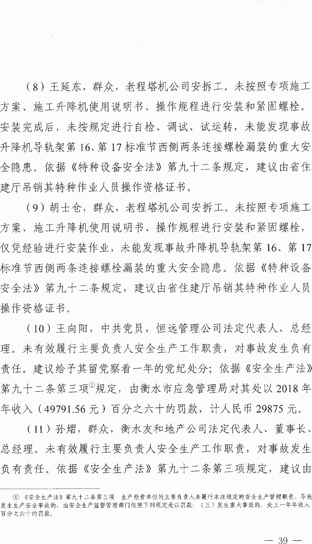 王延東,安拆工,建議吊銷特種作業人員操作資格證書,已被檢察機關批準逮捕。