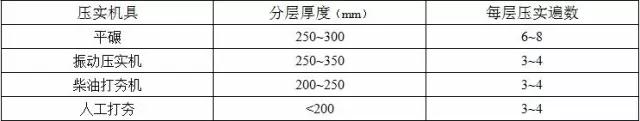 1、填方施工過程中應檢查排水措施,每層填筑厚度、含水量控制、壓實程度。填筑厚度及壓實遍數應根據土質,壓實系數及所用機具確定。如無試驗依據,應符合下表的規定。