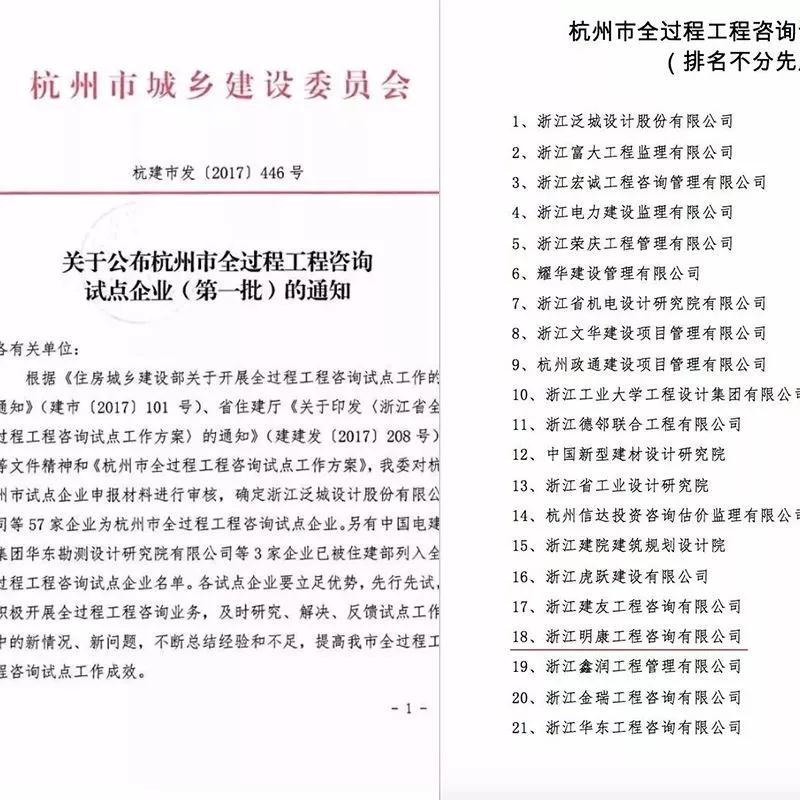 2017年,明康咨詢緊跟工程咨詢行業改革轉型步伐,成功入選了杭州市首批全過程工程咨詢試點企業,也憑借優質服務打造出一批代表工程。