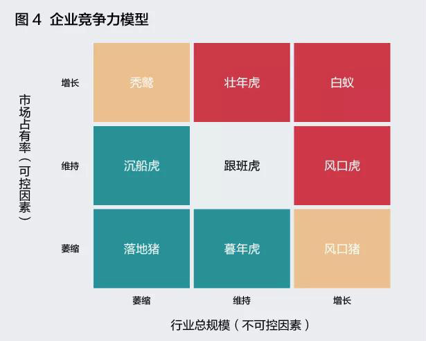 從市占率和行業(yè)大盤兩個(gè)維度來分析企業(yè)的競爭力,筆者整理了一個(gè)模型(如圖4)。需要說明的是,這個(gè)模型和波士頓矩陣、GE矩陣有一定的相似性,但是在橫縱軸的指標(biāo)選擇上更加簡潔。另外,我們也嘗試對于每類業(yè)務(wù)的狀態(tài)進(jìn)行分類,并給出相應(yīng)的財(cái)務(wù)效能判斷。